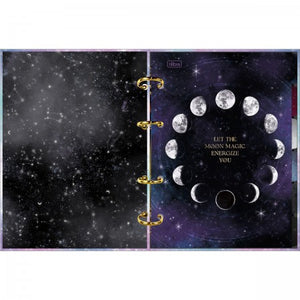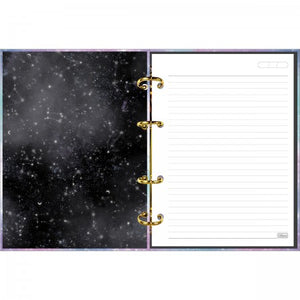 -O Caderno Argolado Cartonado Colegial Magic 160 Folhas possui formato compacto, é leve e bastante funcional. Vem com capa dura com detalhe metalizado e parte interna decorada, divisórias, folha adesiva, folhas pautadas e bolsa plástica para guardar trabalhos e anotações.