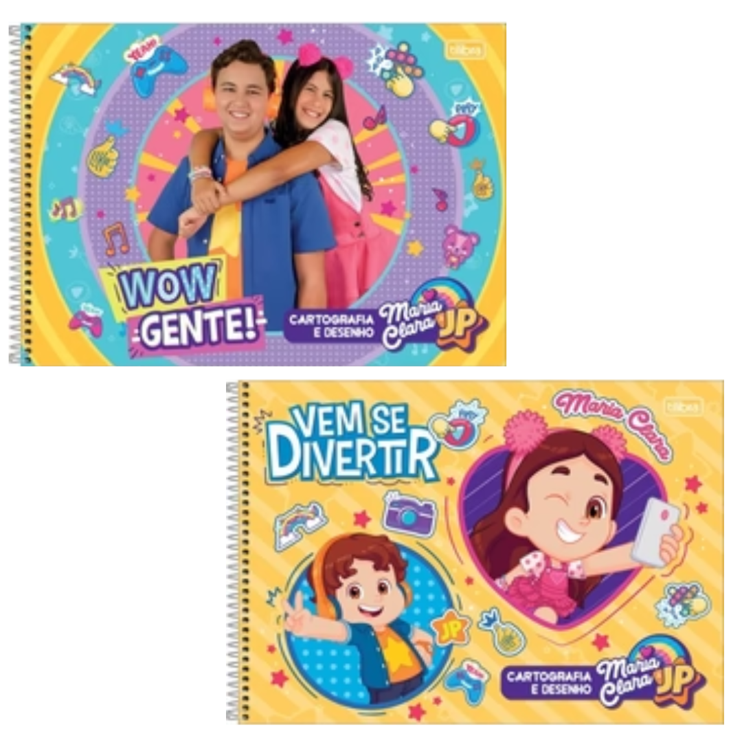 -O Caderno de Cartografia e Desenho Espiral Capa Dura Maria Clara e JP 80 Folhas possui capa dura com a parte interna decorada, folha de adesivos e folhas sem pautas.