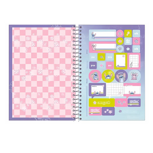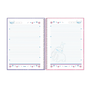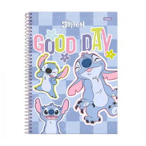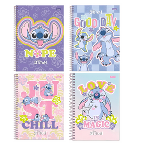 O caderno Stitch possui 160 folhas, capa dura, bolsa plástica interna, folha de adesivos, folhas pautadas decoradas, acabamento em detalhes metalizados na capa e espiral colorido.