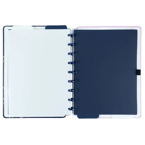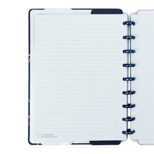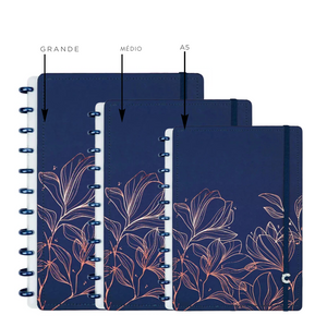 Disponível em três tamanhos – A5, Médio e Grande – o caderno possui capa e contracapa rígidas, 01 folha de adesivos, 01 bolsa plástica, 01 folha de face chart, 01 folha de instruções de uso e manuseio, além de refis e acessórios da marca no verso. Conta ainda com 01 folha de identificação com calendário no verso, 04 divisórias com abas para identificação (02 azuis marinho e 02 brancas), 80 folhas offset 90g (60 folhas pautadas e 20 folhas lisas brancas para você imprimir e voltar ao Caderno Inteligente) e 01 suporte com elástico para 01 caneta ou 01 lápis.