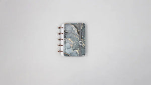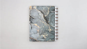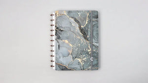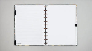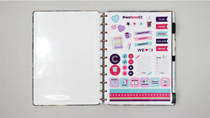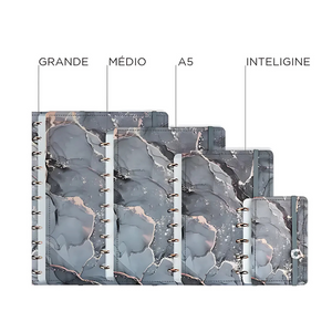 ⋆ A5, Médio ou Grande: Capa e contracapa rígidas, 01 folha de adesivos, 01 bolsa plástica, 01 folha de instrução de uso e manuseio, com refis e acessórios da marca disponíveis no verso, 01 folha de identificação com calendário no verso, 04 divisórias com abas para identificação (02 pretas e 02 transparentes), 80 folhas offset 90g (60 folhas pautadas e 20 folhas lisas brancas para impressão), 01 suporte com elástico para 01 caneta ou 01 lápis e discos M + elástico.