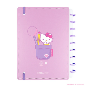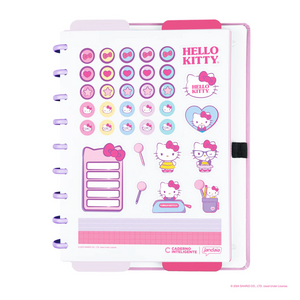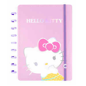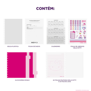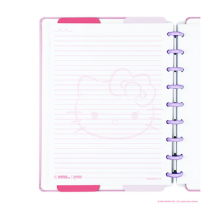 Cada página é decorada com detalhes temáticos da Hello Kitty, como a personagem e linhas rosa, tornando suas anotações mais alegres e inspiradoras.