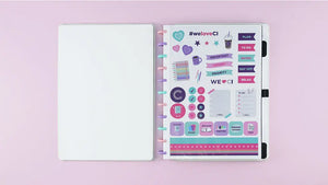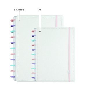 ⋆ A5 e Grande: Capa e contracapa rígidas, 01 folha de adesivos, 01 bolsa plástica, 01 folha de instrução de uso e manuseio, com refis e acessórios da marca disponíveis no verso, 01 folha de identificação com calendário no verso, 04 divisórias com abas para identificação, 80 folhas offset 90g (60 folhas pautadas e 20 folhas lisas brancas para impressão), 01 suporte com elástico para 01 caneta ou 01 lápis e discos M + elástico.