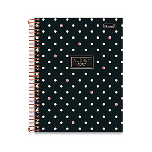 Deixe-se inspirar pela elegância vintage da nossa Bonequinha de Luxo, com a Linha Audrey! O caderno universitário vem com bolsa portfólio, cartela de adesivos, editorial, divisórias de matérias, miolo com microsserrilhas e espiral rosê gold. Perfeito para amantes de design clássico e sofisticado.