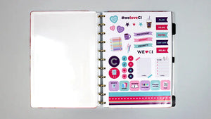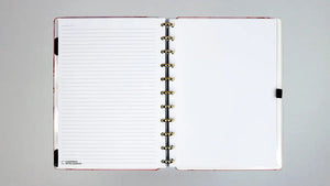 ⋆ A5, Médio ou Grande: Capa e contracapa rígidas, 01 folha de adesivos, 01 bolsa plástica, 01 folha de instrução de uso e manuseio, com refis e acessórios da marca disponíveis no verso, 01 folha de identificação com calendário no verso, 04 divisórias com abas para identificação (02 pretas e 02 transparentes), 80 folhas offset 90g (60 folhas pautadas e 20 folhas lisas brancas para impressão), 01 suporte com elástico para 01 caneta ou 01 lápis e discos M + elástico.