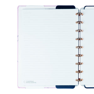 Disponível em três tamanhos – A5, Médio e Grande – o caderno possui capa e contracapa rígidas, 01 folha de adesivos, 01 bolsa plástica, 01 folha de face chart, 01 folha de instruções de uso e manuseio, além de refis e acessórios da marca no verso. Conta ainda com 01 folha de identificação com calendário no verso, 04 divisórias com abas para identificação (02 azuis marinho e 02 brancas), 80 folhas offset 90g (60 folhas pautadas e 20 folhas lisas brancas para você imprimir e voltar ao Caderno Inteligente) e 01 suporte com elástico para 01 caneta ou 01 lápis.