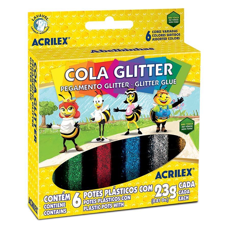 -Foi desenvolvida para trabalhos escolares e artesanais. Ideal para atividades de desenvolvimento artístico. Possui um exclusivo bico aplicador que facilita a pintura, podendo ser usada também com esponja ou pincel, para fazer colagens, decorar e pintar sobre papel, papel cartão e cartolina. A Cola Glitter Acrilex não é tóxica e possui brilho intenso.