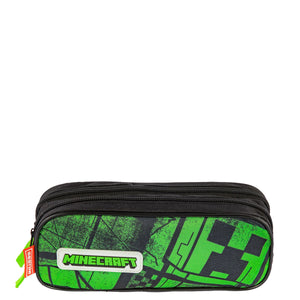 O estojo oficial Minecraft, da Sestini, traz o Creeper no painel frontal, logo emborrachada e dois puxadores em cadarço. Os compartimentos com fecho de zíper são práticos para organizar o material escolar.