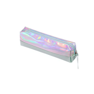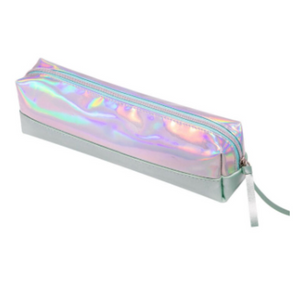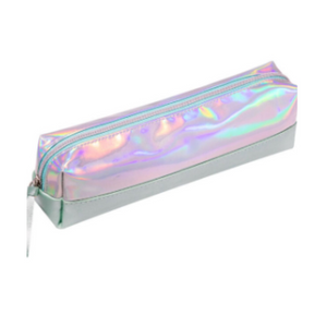 Estojo, estampa holográfico com detalhe na cor verde água, material em PVC, fechamento com zíper dourado, 1 zíper, puxador em metal, material de fácil limpeza.