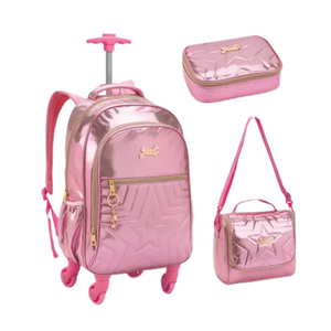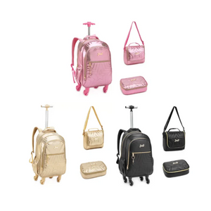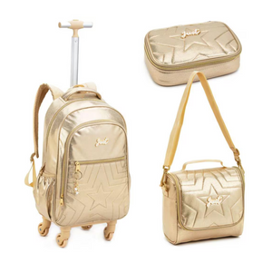 O Kit Mochila de Rodinhas + Lancheira + Estojo Box Just Estrelas DENLEX é o companheiro ideal para crianças de todas as idades que buscam um produto prático, confortável e estiloso. Você tem opção de 3 cores lindas para escolher, você a opção nas cores dourada, Rosa e Preta! Agora e escolher a cor de sua preferência!