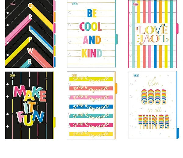 -As divisórias Be Nice são perfeitas para organizar os estudos. Com elas, fica muito mais fácil separar e encontrar as matérias que desejar. Este modelo é comercializado em pacote com 6 unidades em formato colegial, com estampas sortidas e acabamento metalizado.