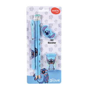Contém: 1 caneta esferográfica (escrita azul), 2 lápis pretos HB, 1 borracha e 1 apontador com depósito.