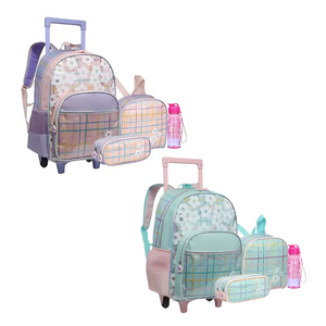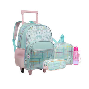 O conjunto inclui uma mochila com rodas, um estojo, uma garrafa e uma lancheira, todos confeccionados em poliéster resistente e fácil de limpar. As rodas garantem mobilidade e conforto, permitindo que as crianças transportem seus materiais de forma leve e divertida.