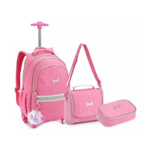 Kit Mochila Escolar de Rodinhas Estampa Bordada Kit de Mochila de Rodinhas, inclui um estojo e uma lancheira com o mesmo design, perfeito para organizar lápis, canetas e outros materiais escolares, e uma lancheira que mantém a comida fresca e deliciosa. Sua filha vai adorar levar esse conjunto para a escola, tornando-se o destaque entre os colegas. Possui ótimo espaço interno para transportar livros e cadernos, mochila resistente para uso de dia dia.