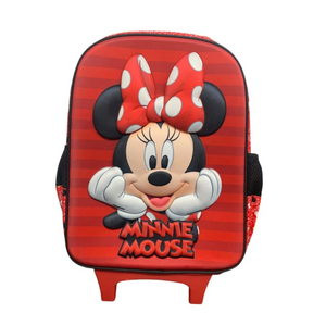 A Mochila Carrinho possui painel frontal EVA 3D Nylon (relevo) com estampa da famosa personagem Disney, Minnie Mouse! Produzida em poliéster resistente e estampado, compartimento principal amplo, 2 bolsos laterais de mesh com poliéster e elástico, fechamento em zíper com puxadores personalizados, alça de mão em poliéster com mesh e haste com trava.