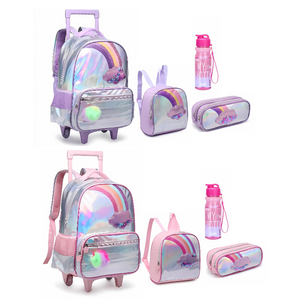 A Mochila de Rodinhas Arco-Íris é a escolha perfeita para quem busca praticidade, estilo e funcionalidade. Ideal para o dia a dia, essa mochila é equipada com: Rodinhas para facilitar o transporte, proporcionando conforto e mobilidade; Design moderno com o tema arco-íris, trazendo um toque vibrante e alegre; Cor principal prata, com detalhes delicados em rosa, tornando-a ainda mais charmosa. Além disso, o conjunto acompanha estojo, lancheira e garrafa d'água, oferecendo tudo o que você precisa para a escola ou para passeios. Perfeita para quem procura organização e praticidade em um único produto.