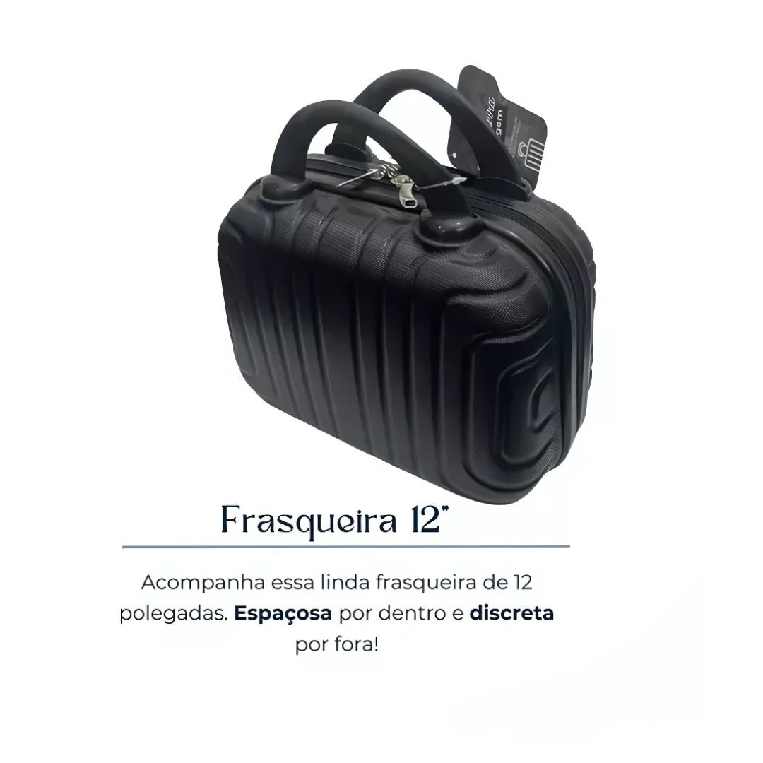 - Uma frasqueira de 12", adequada para objetos pessoais ou itens essenciais durante a viagem.