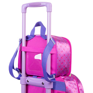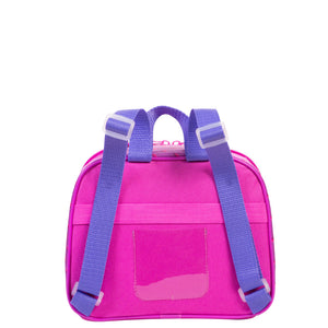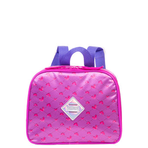 A lancheira que completa a coleção Arco Íris 2, com a mesma estampa colorida e detalhes em corações. Com um revestimento interno resistente a líquidos e fácil de limpar, ela também conta com alças de costas com regulagem e alça carona para ir encaixada no carrinho da sua mochila.