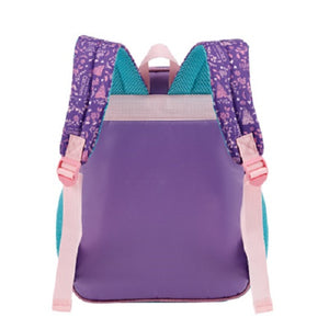 Em tamanho 14", produzida em poliéster resistente e estampado. Painel frontal PVC Cristal Compartimento principal amplo, 2 bolsos laterais mesh, zíper com puxadores simples, alça de mão em nylon e piping com glitter . Alças acolchoadas com regulagem de tamanho para maior conforto.
