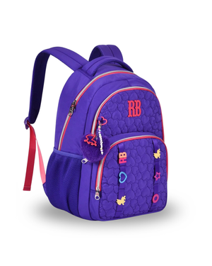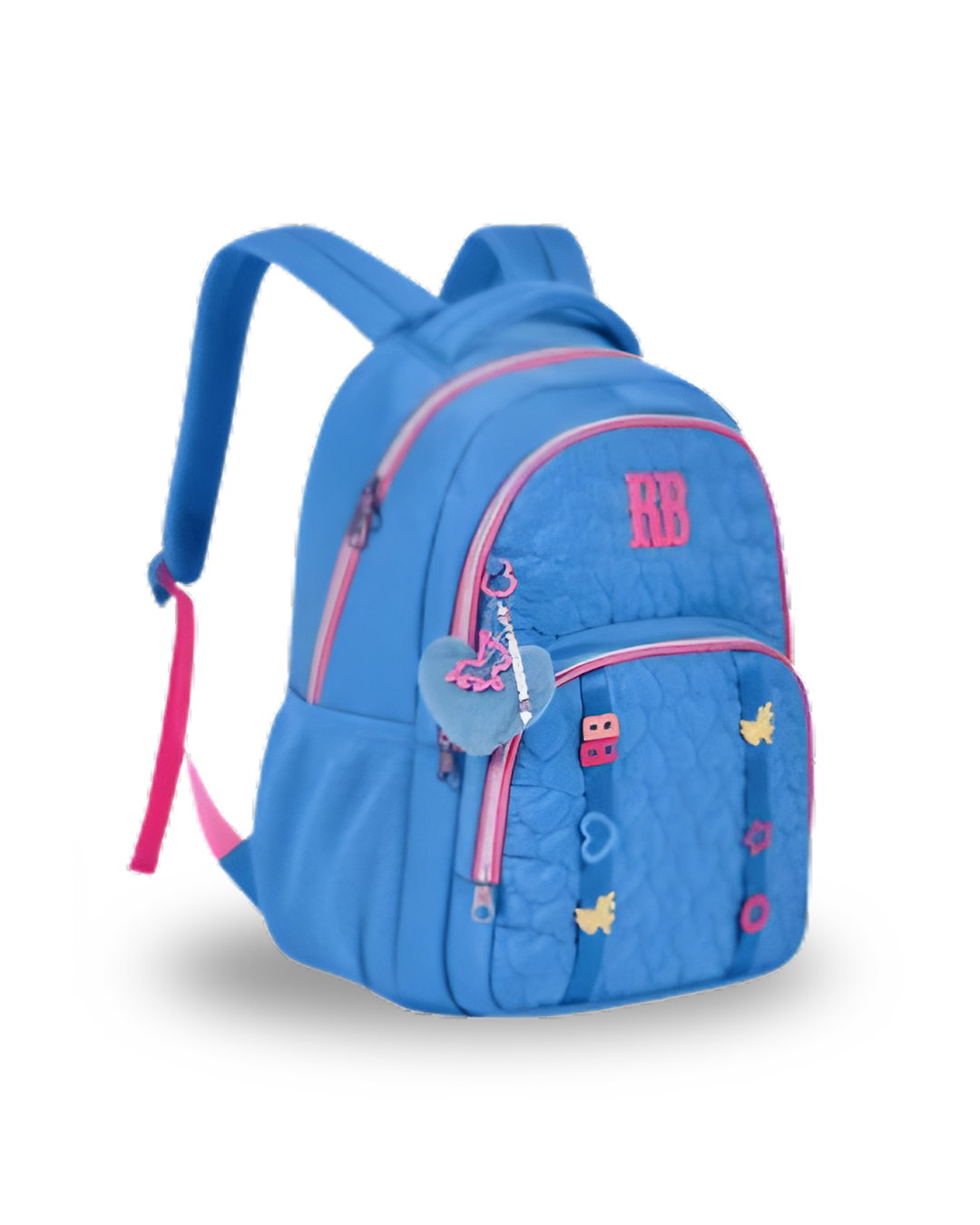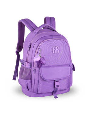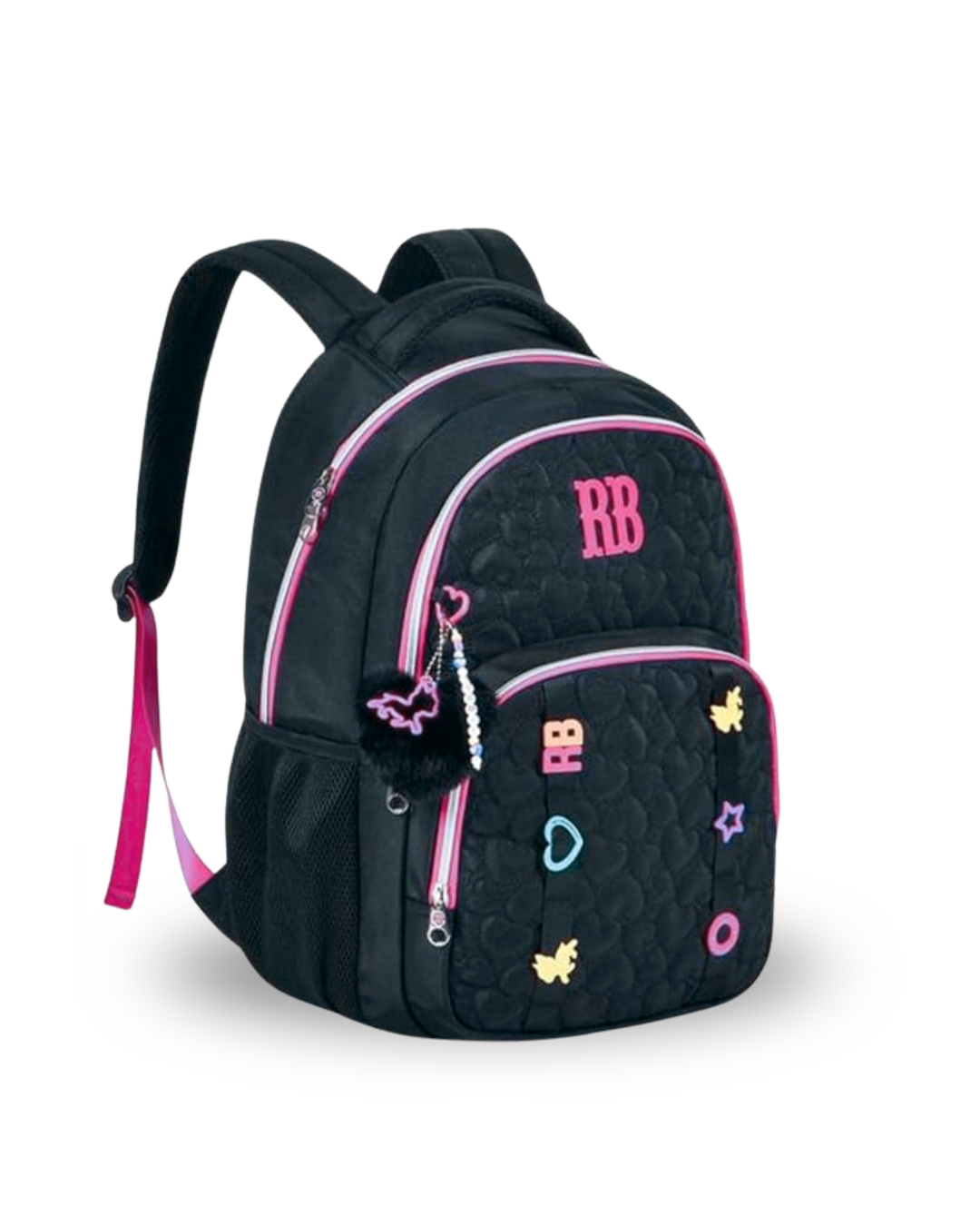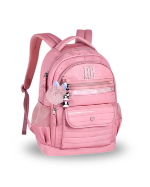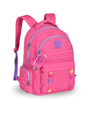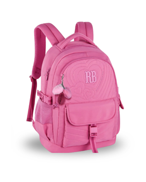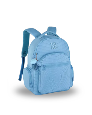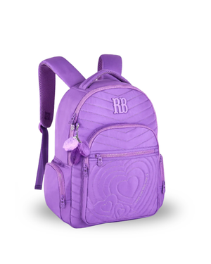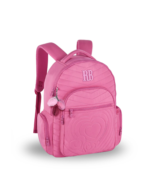 Mochila confeccionada em crinkle metalizado com matelassê, acompanha chaveiro de borracha com pompom de coração e rostinho da RB.