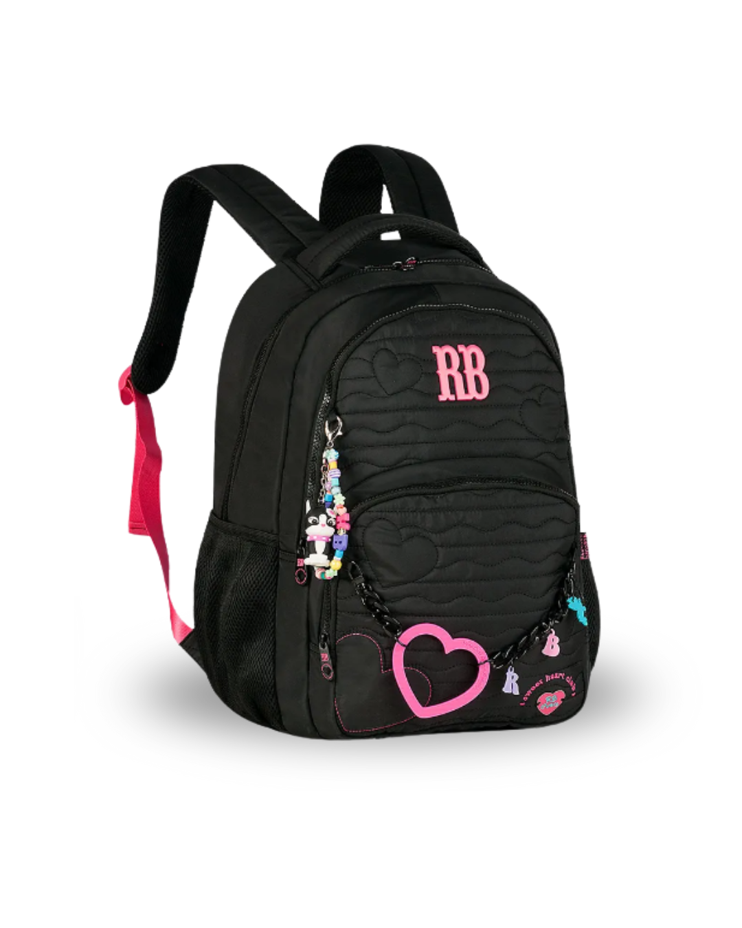 Confeccionada em material soft com matelassê de corações, plaquinha de metal e cadarço acetinado colorido. Acompanha chaveiro de miçangas, mascote 3D e corrente com coração emborrachado.