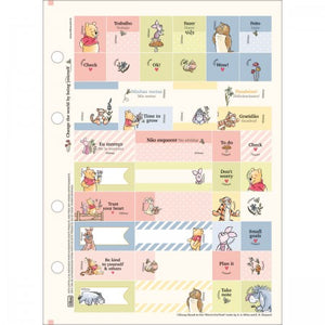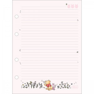 -O Refil Tiliflex para Caderno Argolado Colegial Pooh 80 Folhas possui folha com adesivos funcionais e folhas pautadas decoradas coladas.